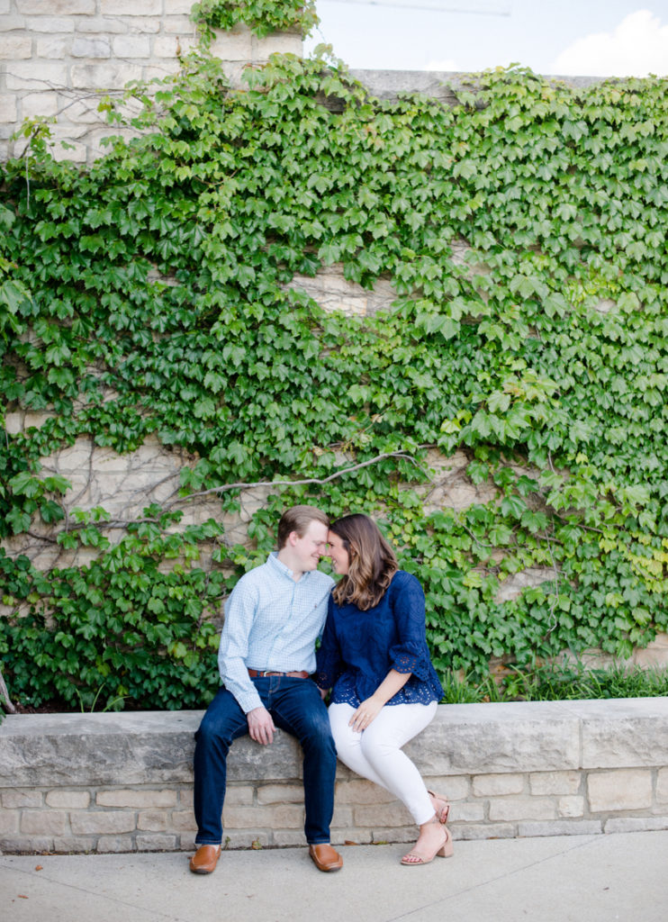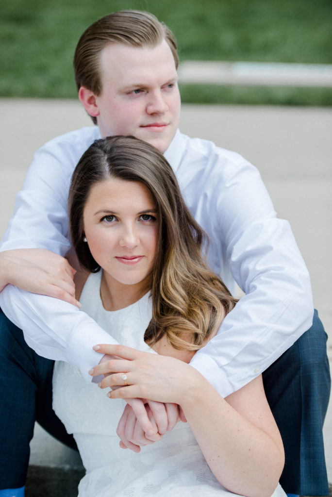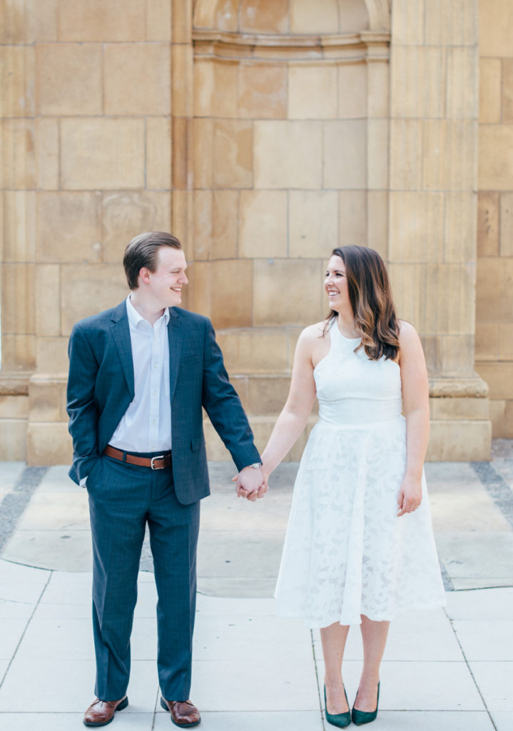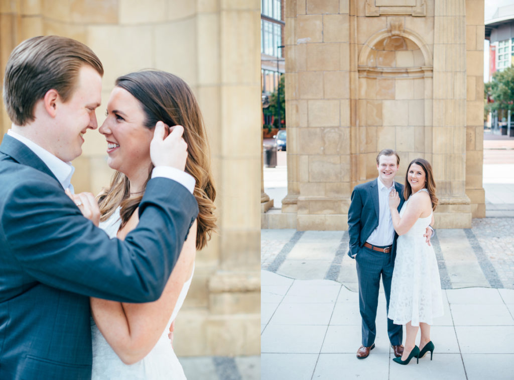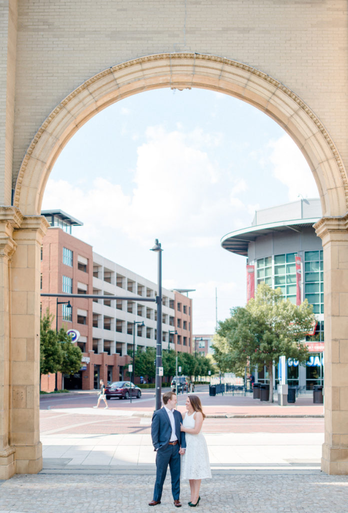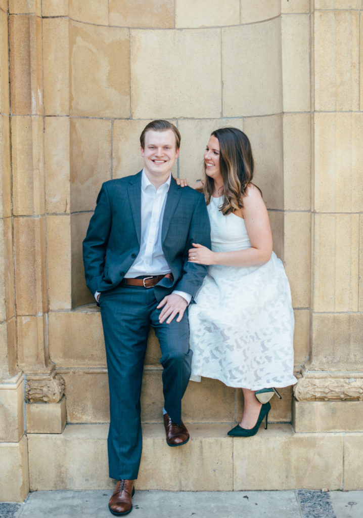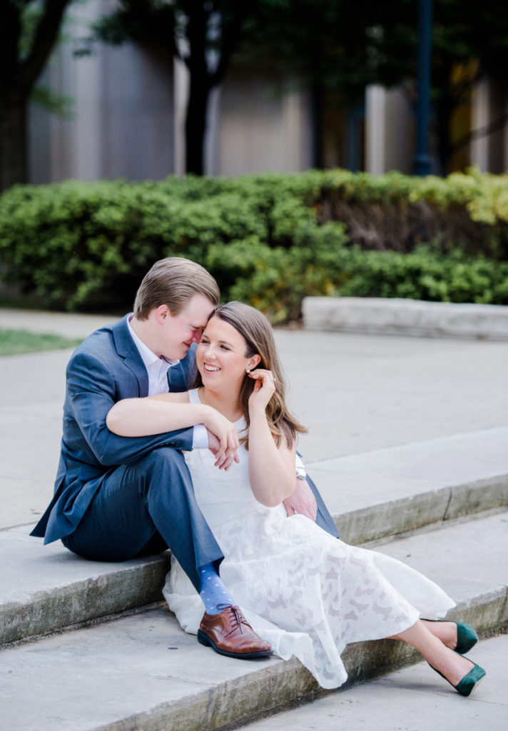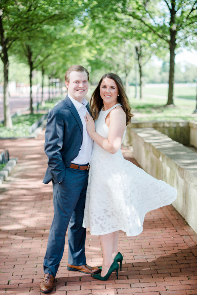 I could see Ashley and John walking across the Union Station Arch lawn to get to where we agreed to take engagement photos. I hope I wasn’t too intimidating when I squealed hello as they got closer because of how stunning Ashley looked. I love it when a couple dresses up more for their shoot. Guys should be in suits more often. And do you spy those green heels?! Ashley threw a nod to their bridal party colors for their wedding coming up this December.