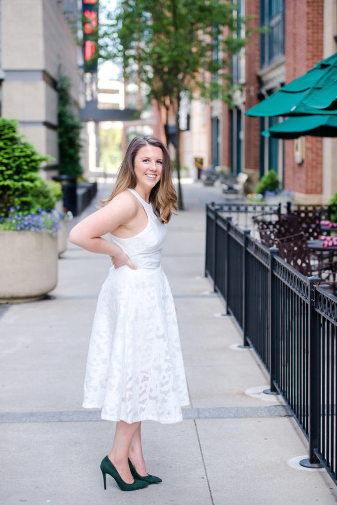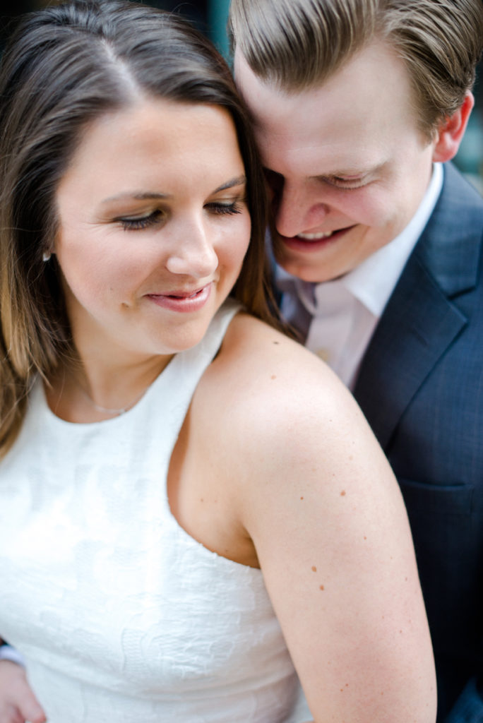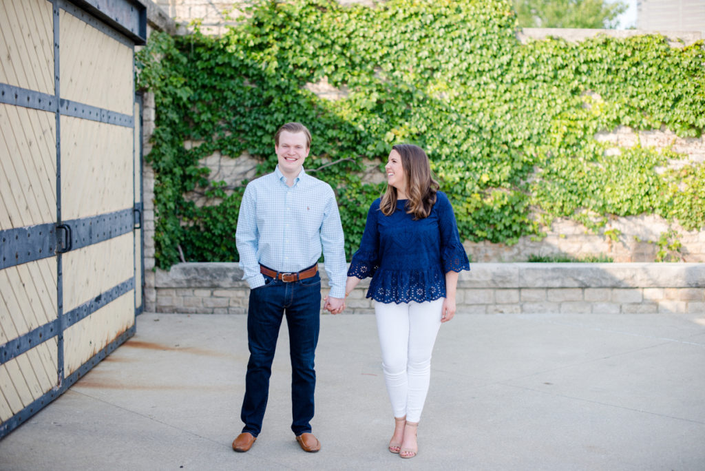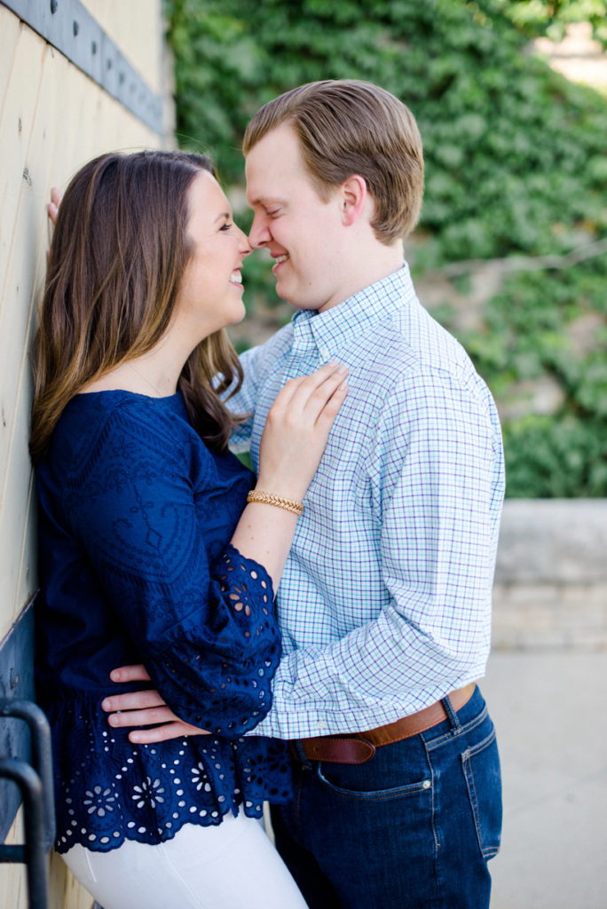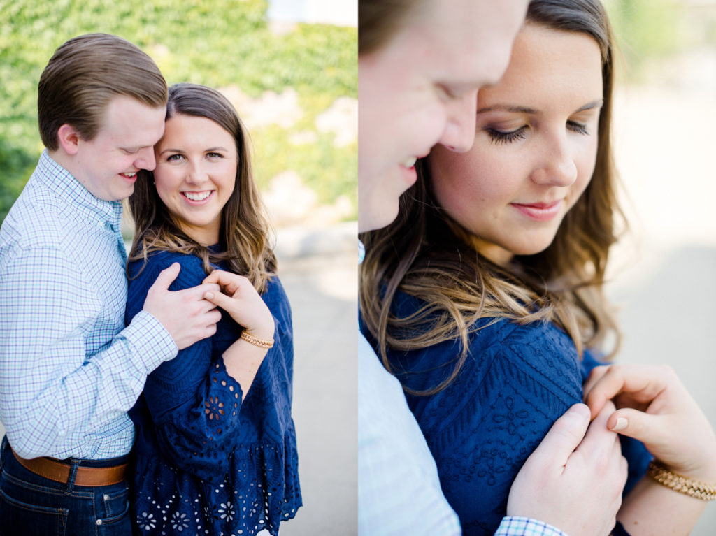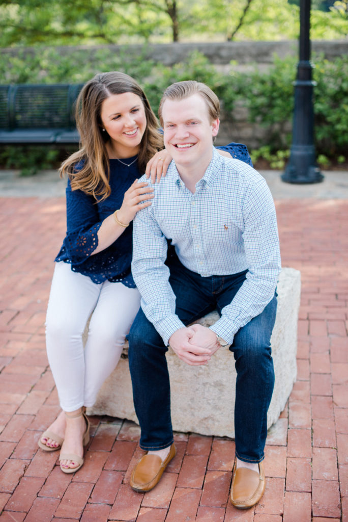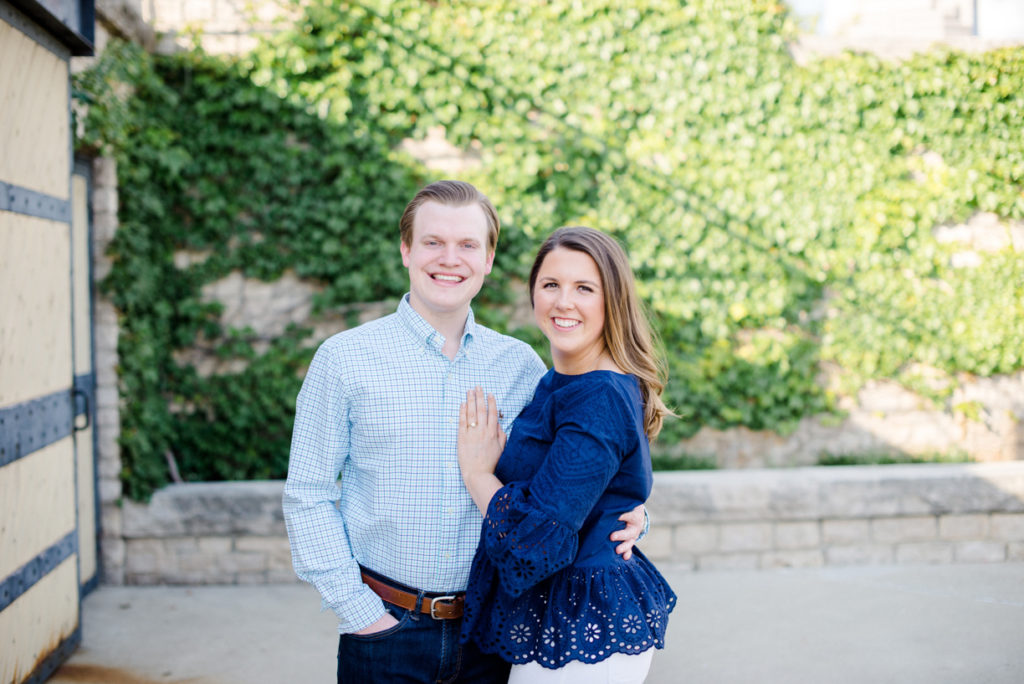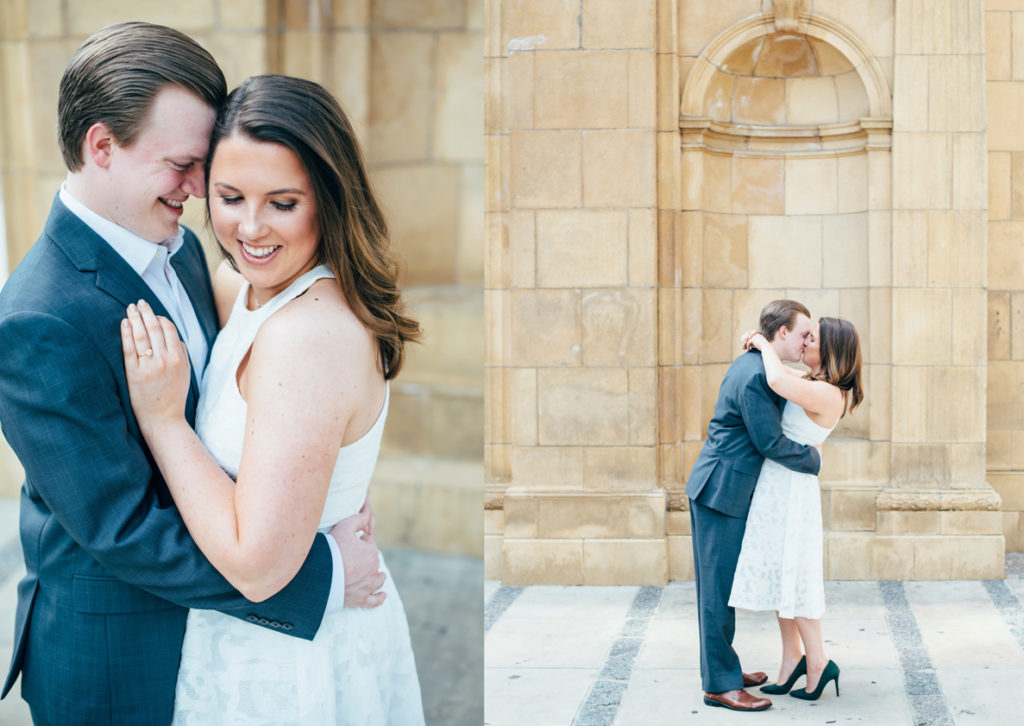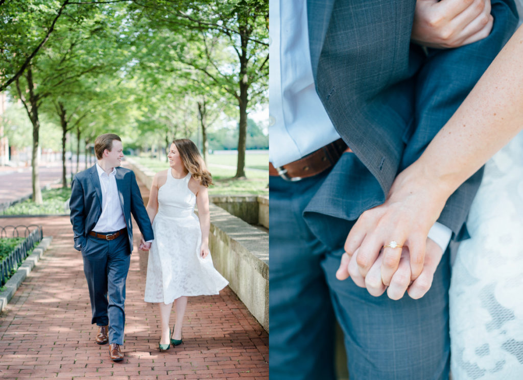 I could see Ashley and John walking across the Union Station Arch lawn to get to where we agreed to take engagement photos. I hope I wasn’t too intimidating when I squealed hello as they got closer because of how stunning Ashley looked. I love it when a couple dresses up more for their shoot. Guys should be in suits more often. And do you spy those green heels?! Ashley threw a nod to their bridal party colors for their wedding coming up this December.