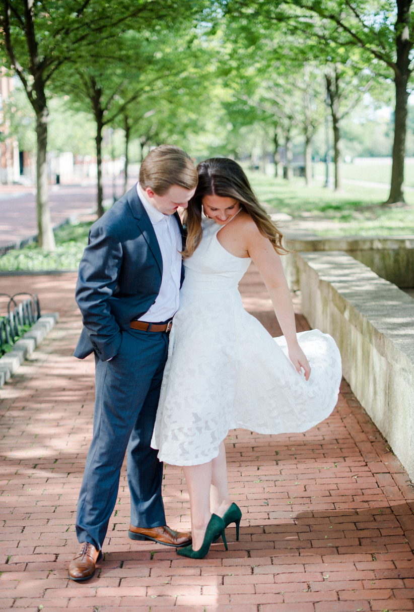 I could see Ashley and John walking across the Union Station Arch lawn to get to where we agreed to take engagement photos. I hope I wasn’t too intimidating when I squealed hello as they got closer because of how stunning Ashley looked. I love it when a couple dresses up more for their shoot. Guys should be in suits more often. And do you spy those green heels?! Ashley threw a nod to their bridal party colors for their wedding coming up this December.