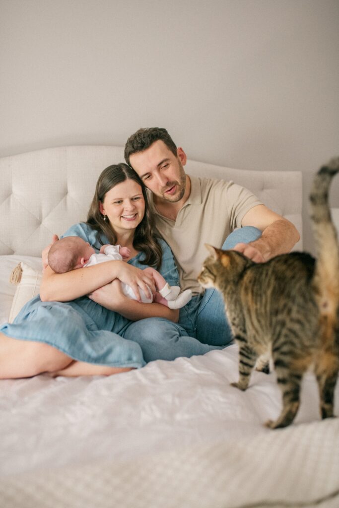 She slowly wandered into the room while we were setting up, gave us all a once-over, and decided she was in. For the rest of the session, she stayed close — watching over her new little brother, curling up nearby, and even jumping into a few photos like a total natural. It was the sweetest surprise and such a meaningful moment for Mom and Dad to see her welcoming him in her own gentle way.