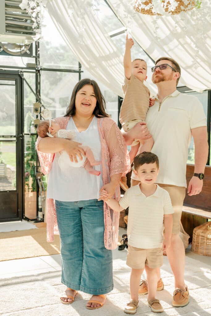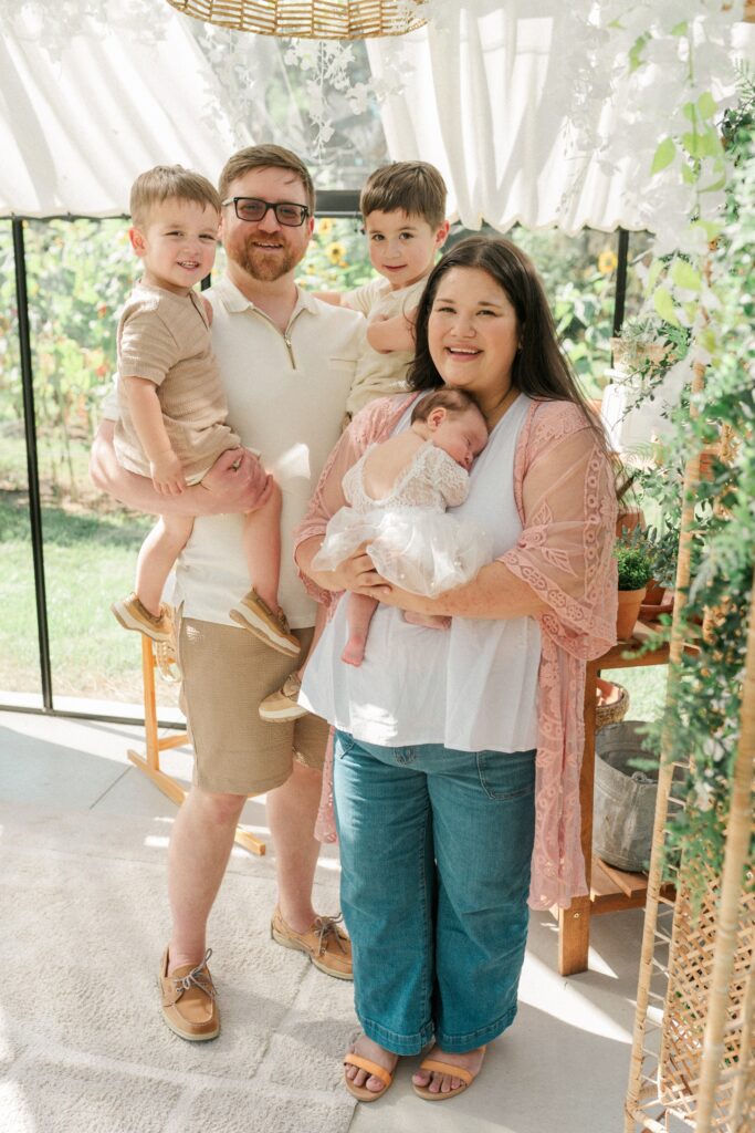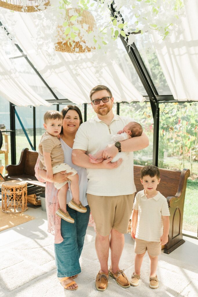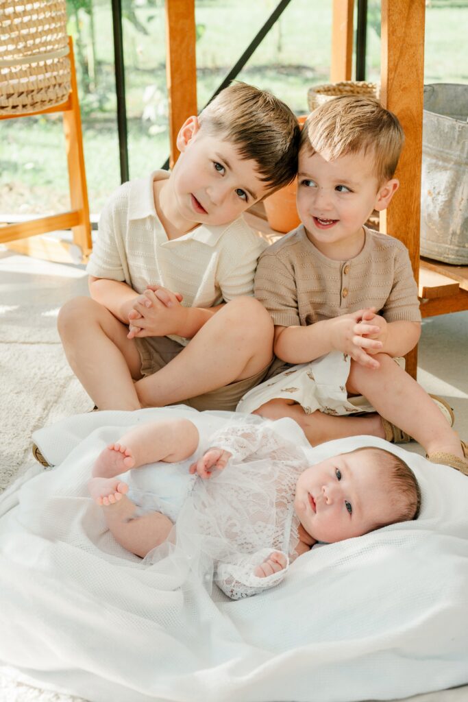 The session took place at the beautiful Humble+Pine greenhouse studio, where the natural light and airy greenery create the dreamiest backdrop. Arden was absolutely precious, and seeing her big brothers take on their new roles melted my heart. They were so gentle and kind with her—little hands softly reaching out, big eyes full of curiosity and love. It’s always incredible to see siblings bond in those very first weeks, and they’re already proving to be the best big brothers.