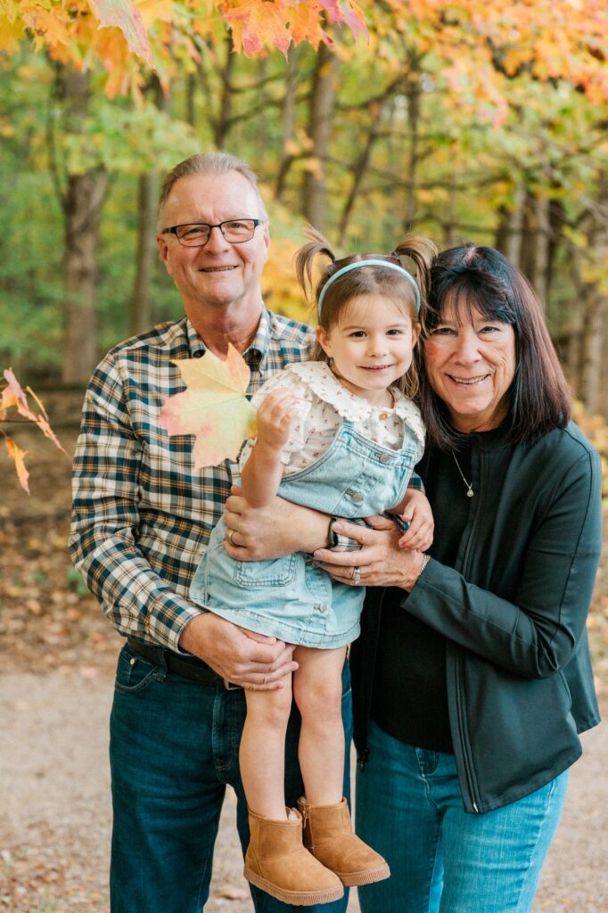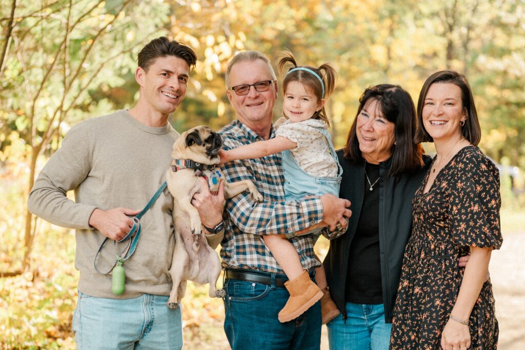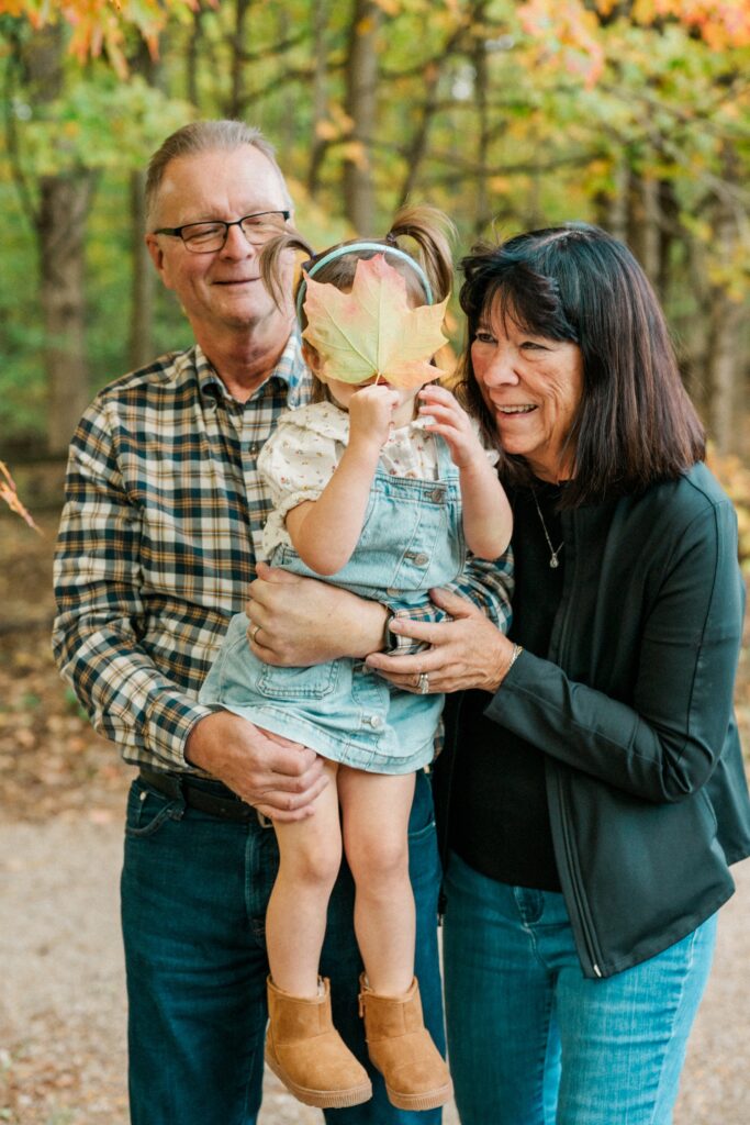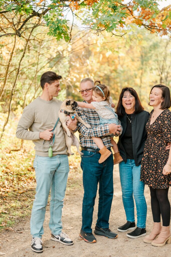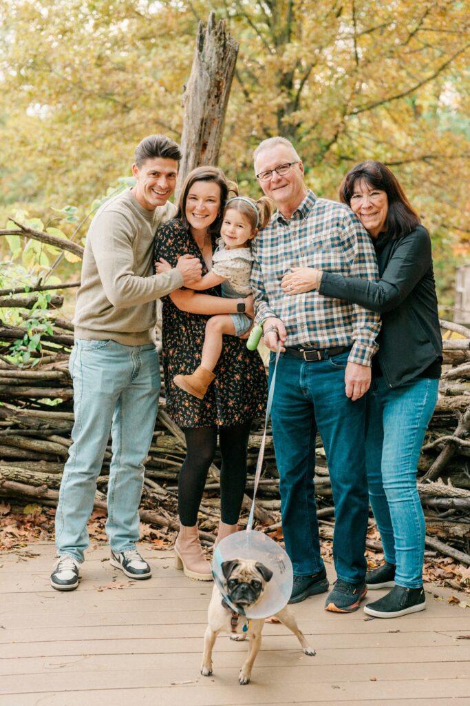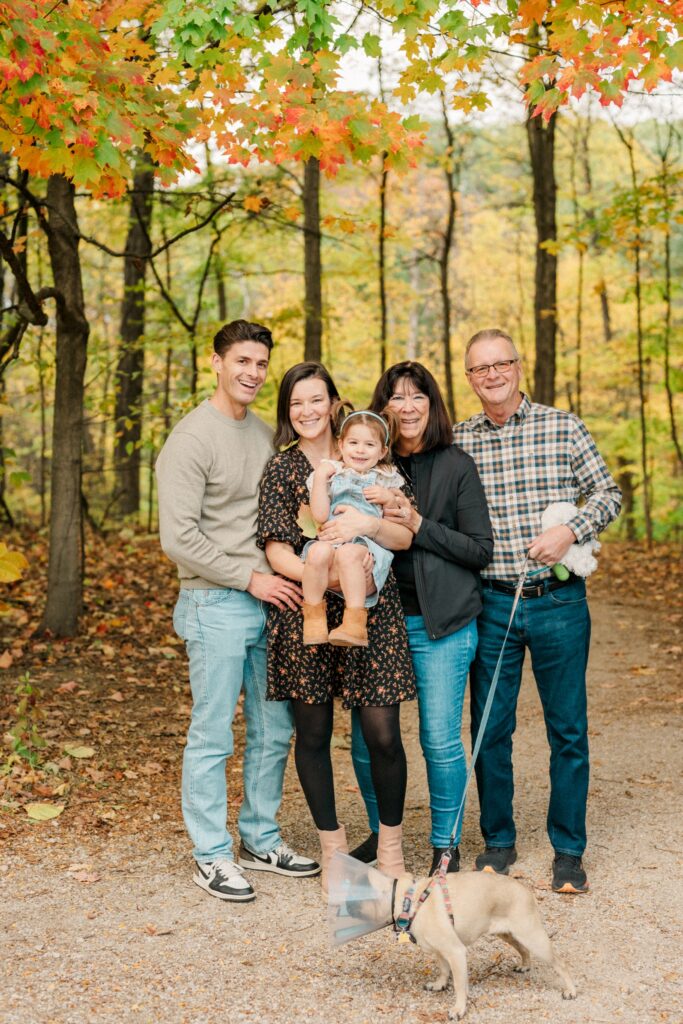 We started the session with Grandma and Grandpa — a must whenever everyone’s together. Then, of course, we had to include Pickles, the family dog, who was thrilled to be part of the action (and maybe even stole the spotlight once or twice). Between chasing leaves and giving kisses, Pickles made sure there were plenty of giggles.