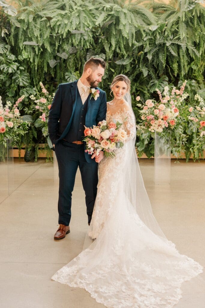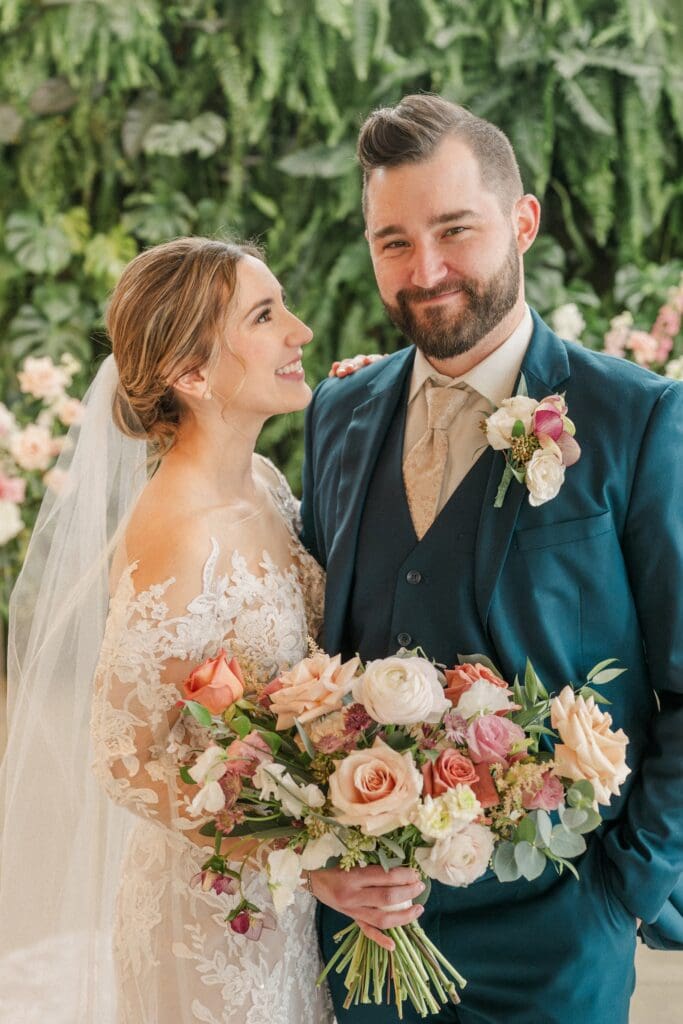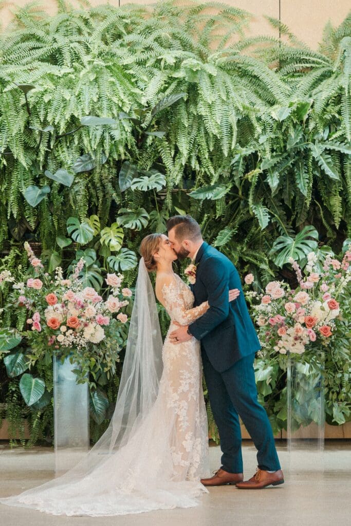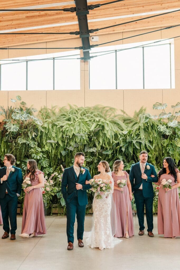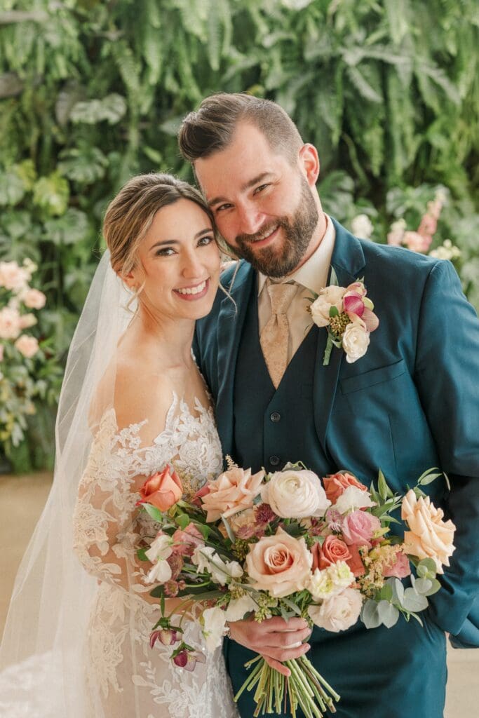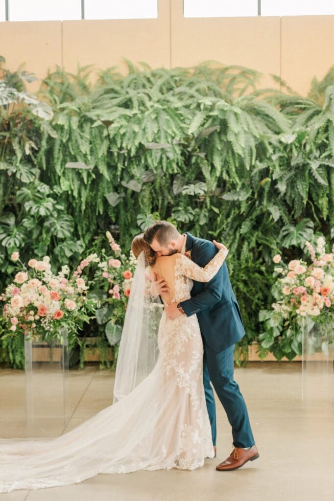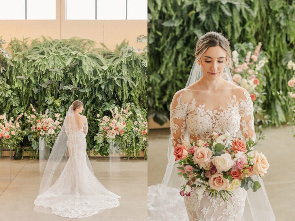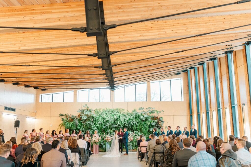 Because winter weddings in Ohio always require a little flexibility, we leaned into one of my favorite features of The Gardens: the sun‑filled arboretum. It was the perfect warm, bright space for portraits, complete with live plants growing along the walls — a dreamy contrast to the snowy landscape outside. It allowed us to create timeless, romantic images without ever worrying about the cold.