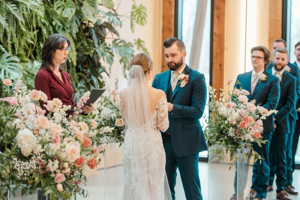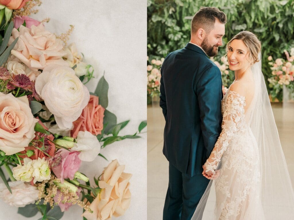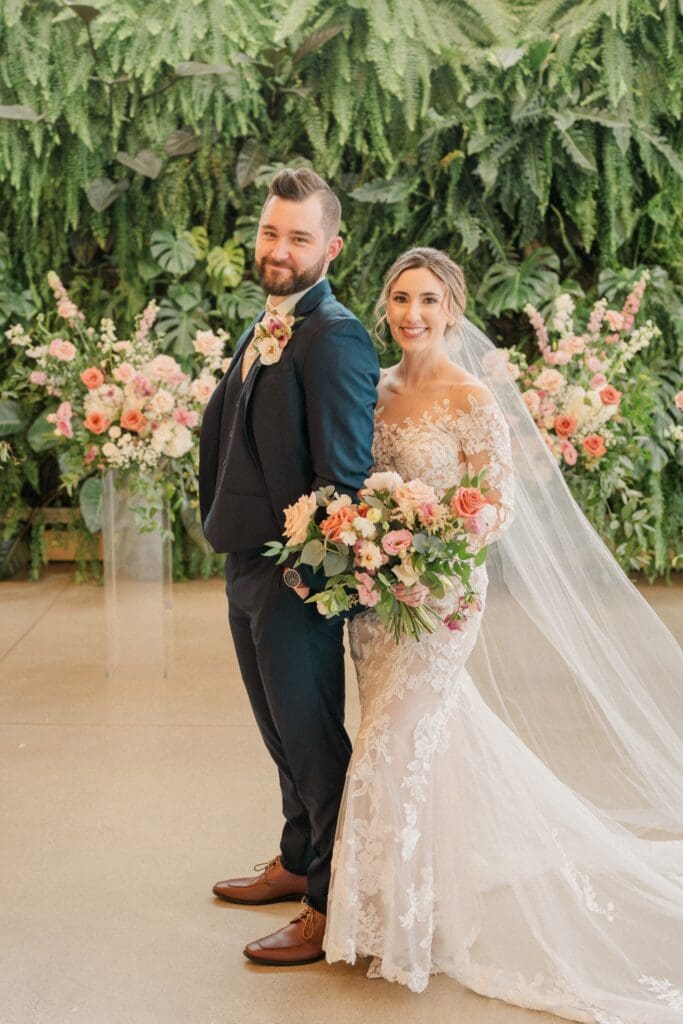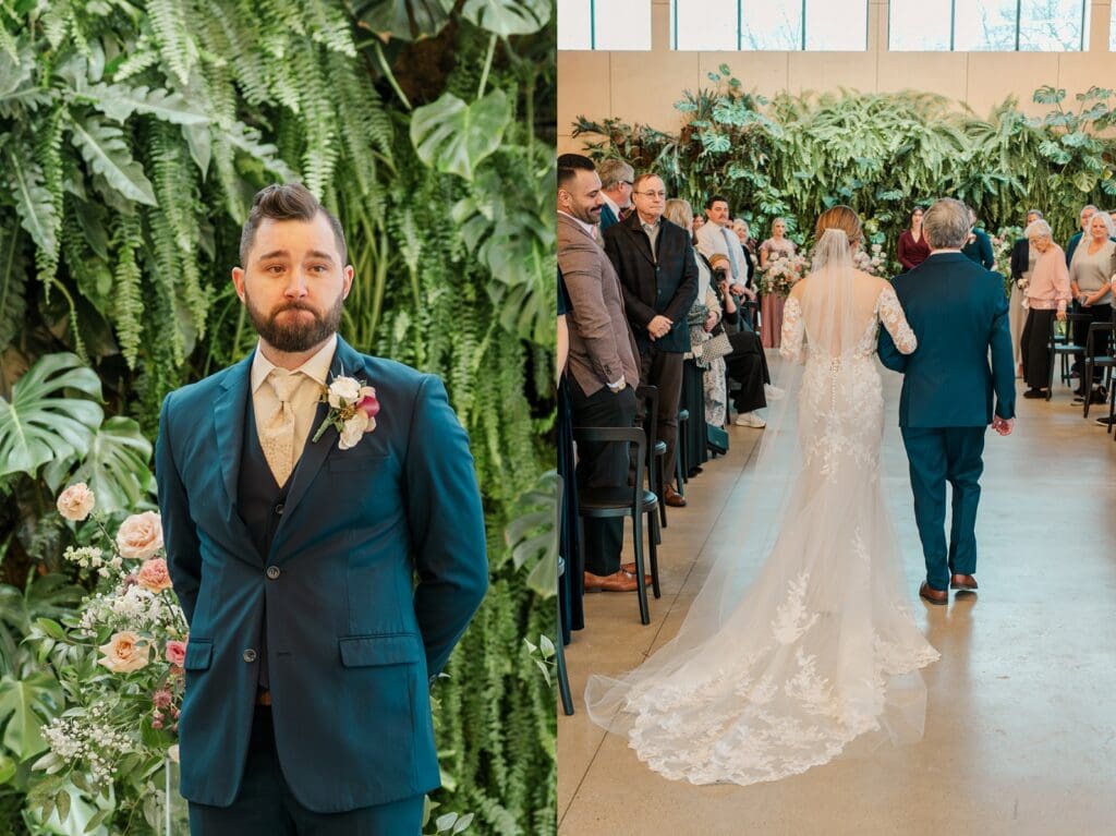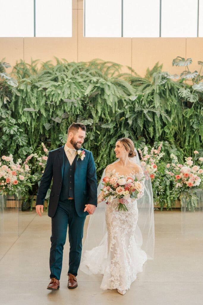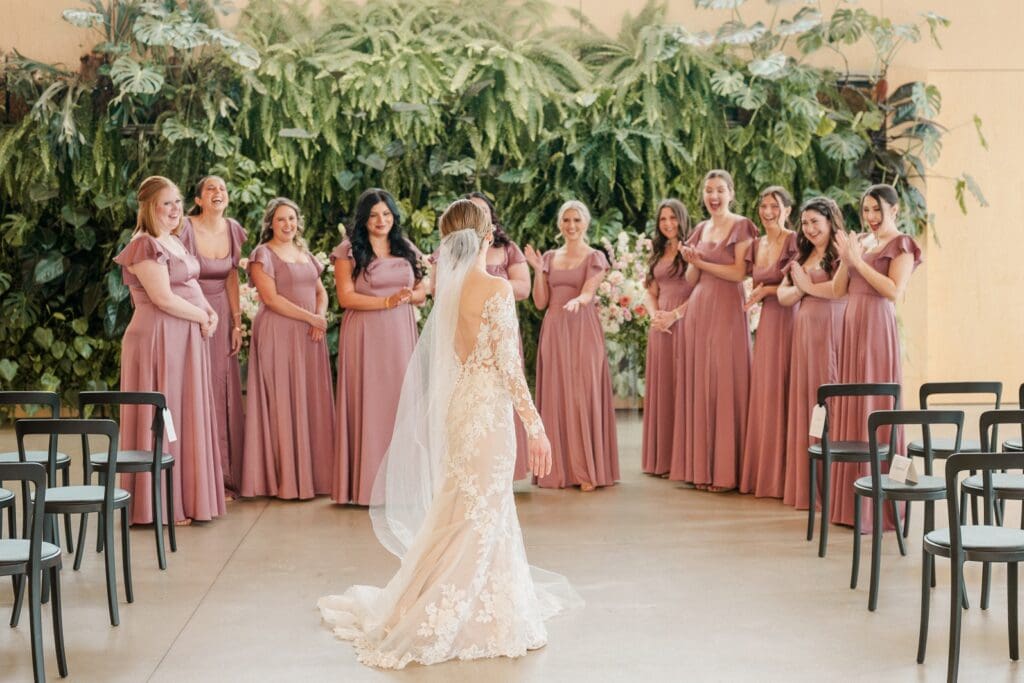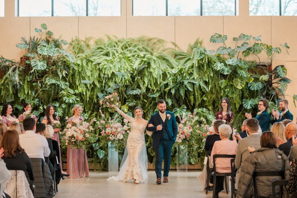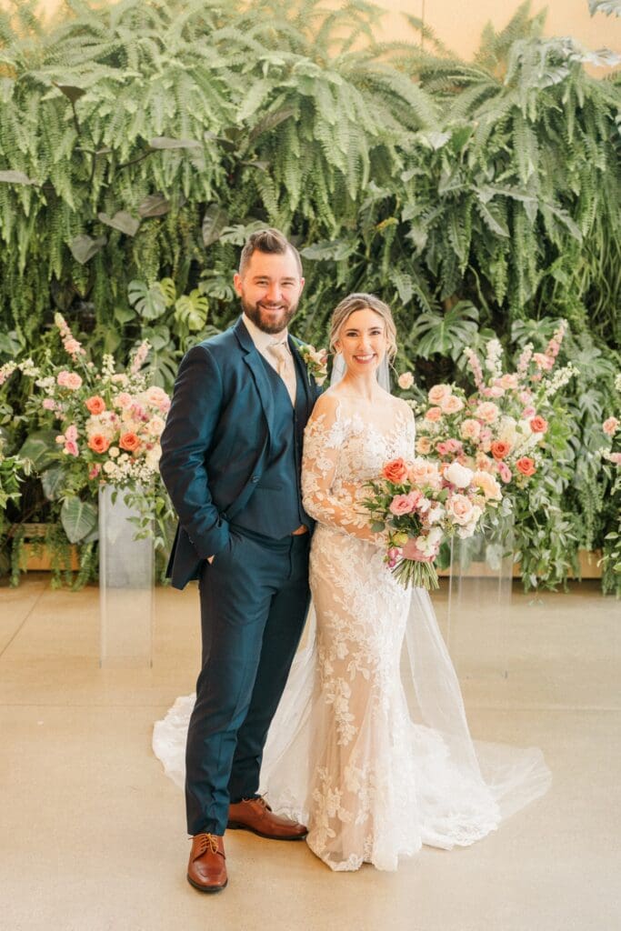 Because winter weddings in Ohio always require a little flexibility, we leaned into one of my favorite features of The Gardens: the sun‑filled arboretum. It was the perfect warm, bright space for portraits, complete with live plants growing along the walls — a dreamy contrast to the snowy landscape outside. It allowed us to create timeless, romantic images without ever worrying about the cold.