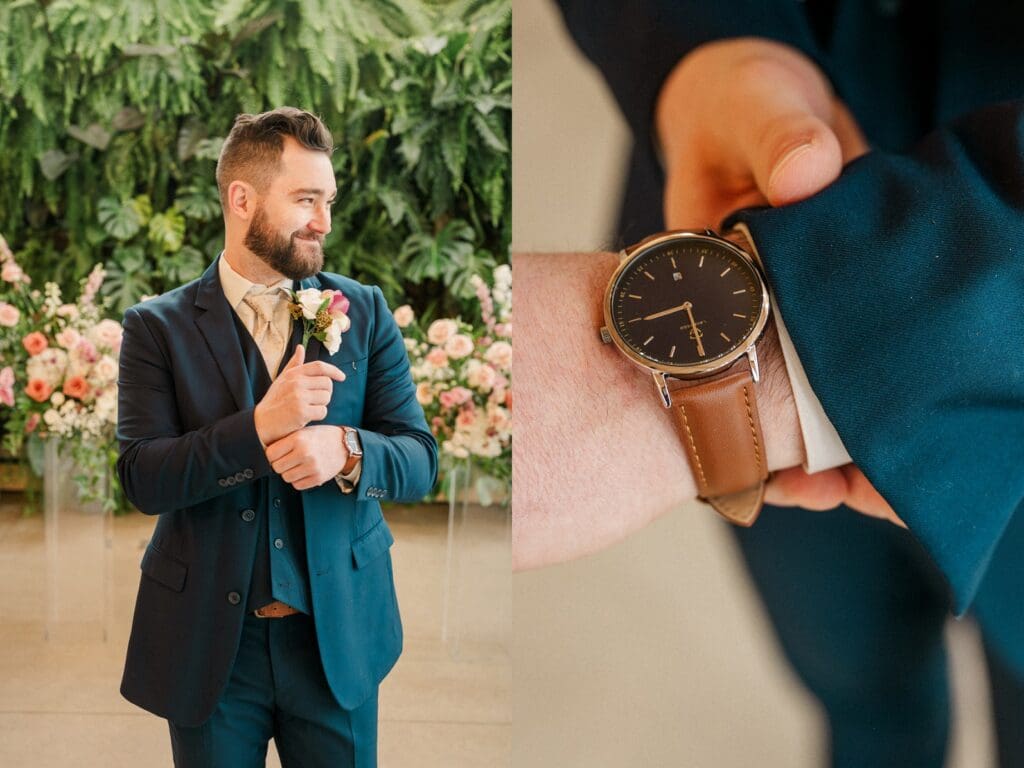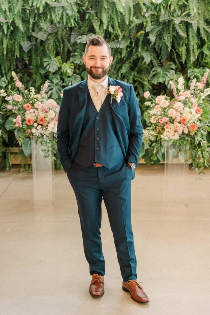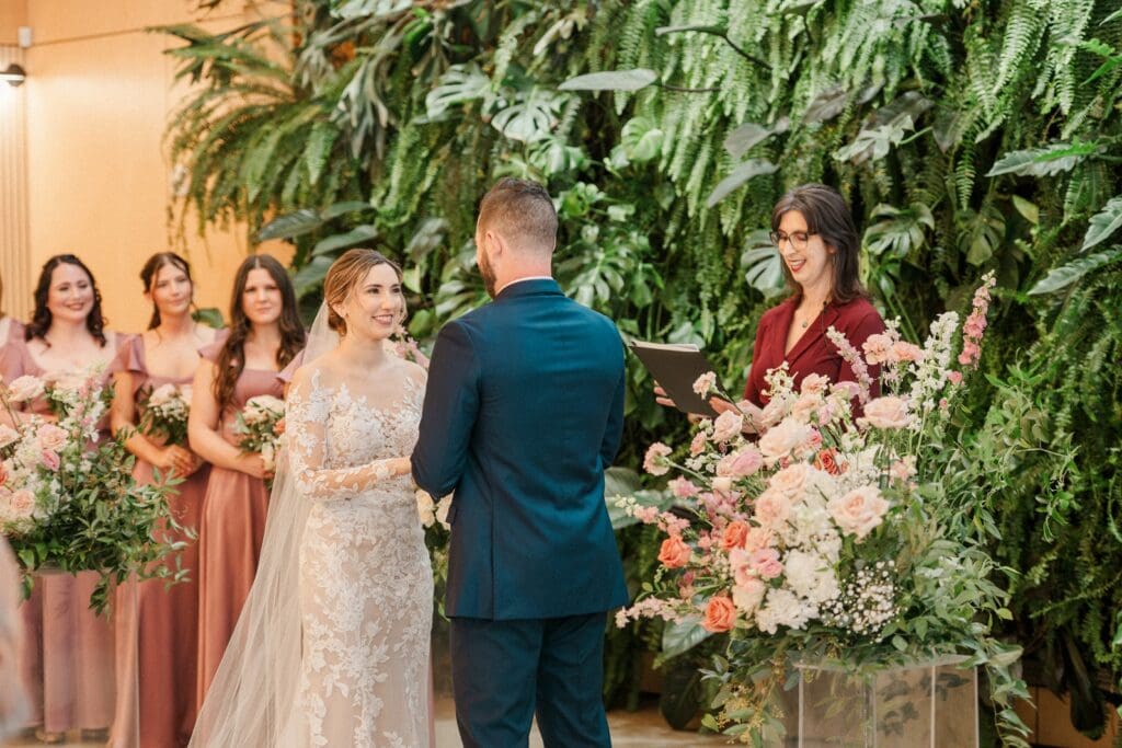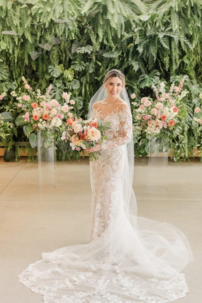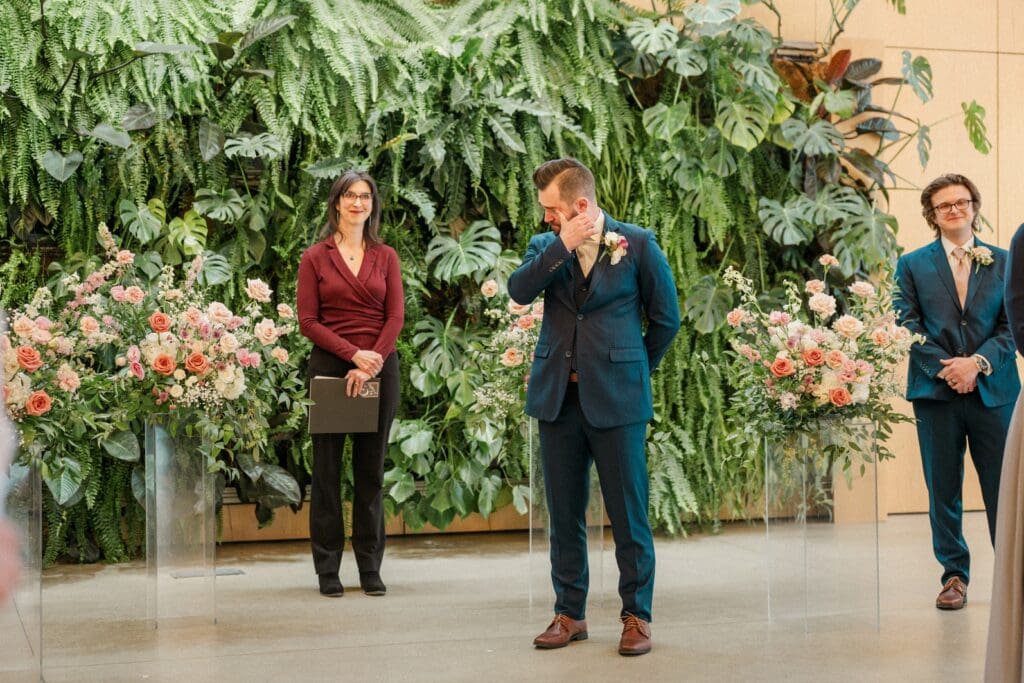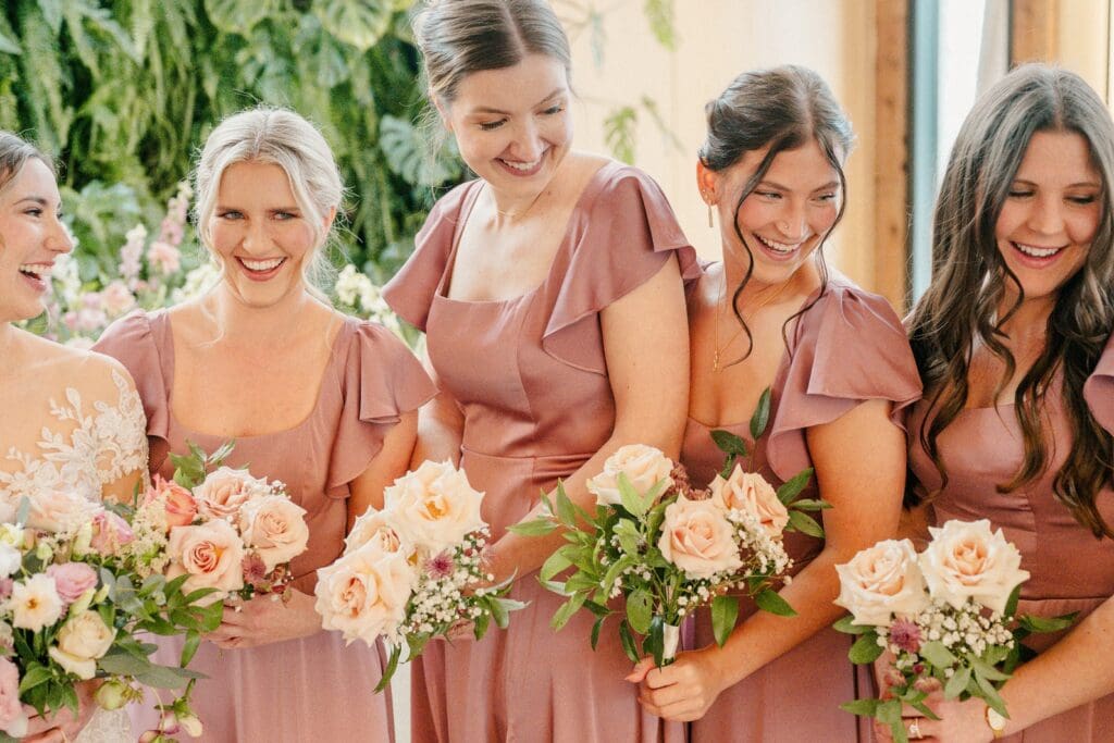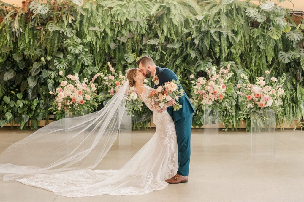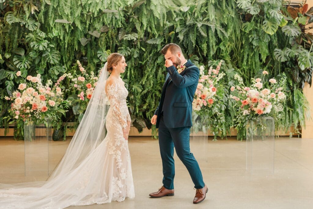 Because winter weddings in Ohio always require a little flexibility, we leaned into one of my favorite features of The Gardens: the sun‑filled arboretum. It was the perfect warm, bright space for portraits, complete with live plants growing along the walls — a dreamy contrast to the snowy landscape outside. It allowed us to create timeless, romantic images without ever worrying about the cold.