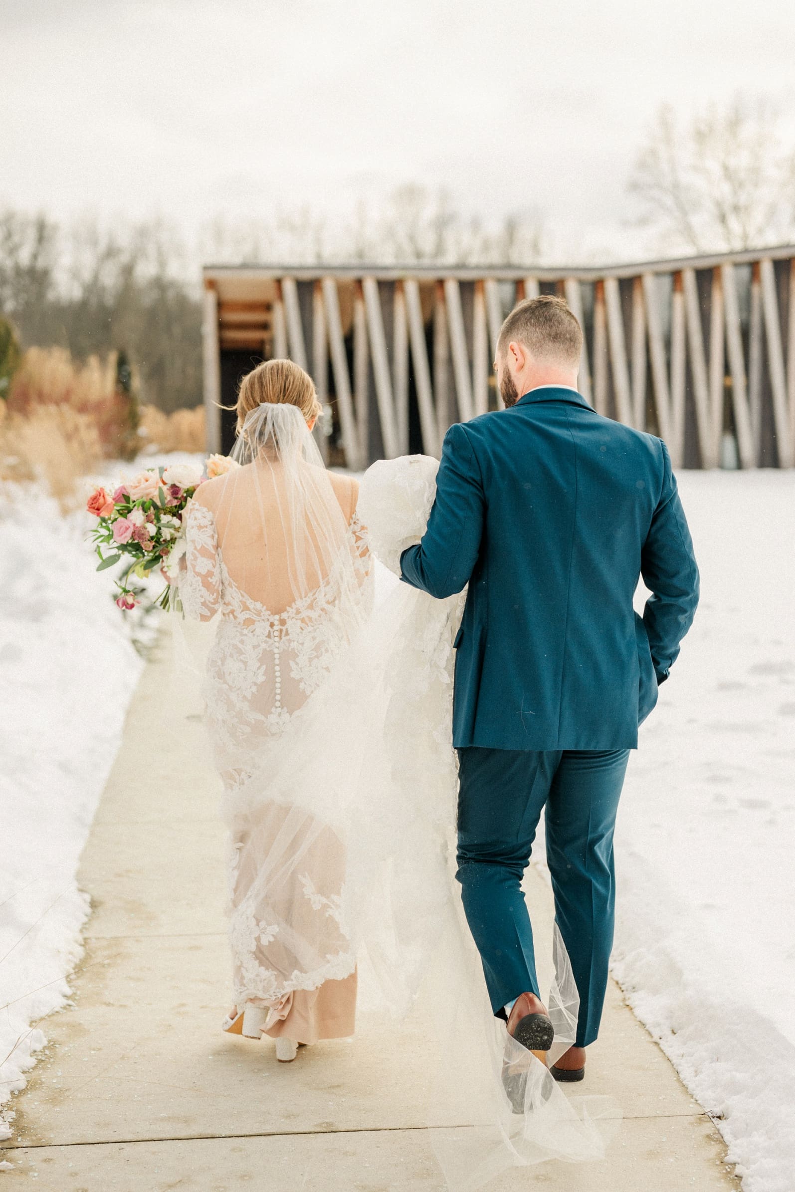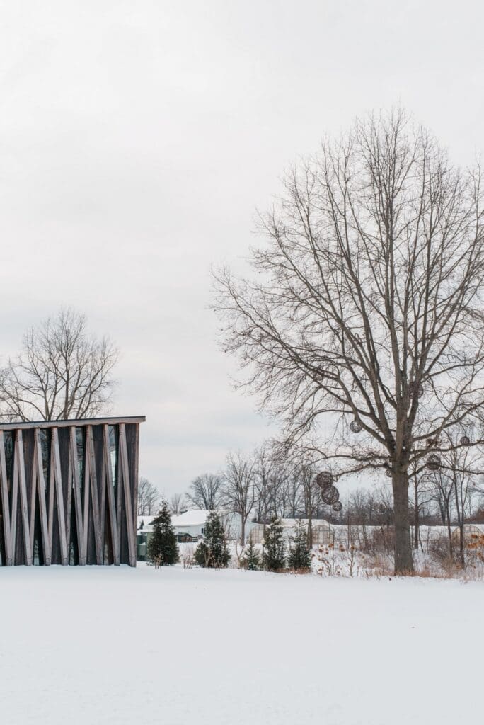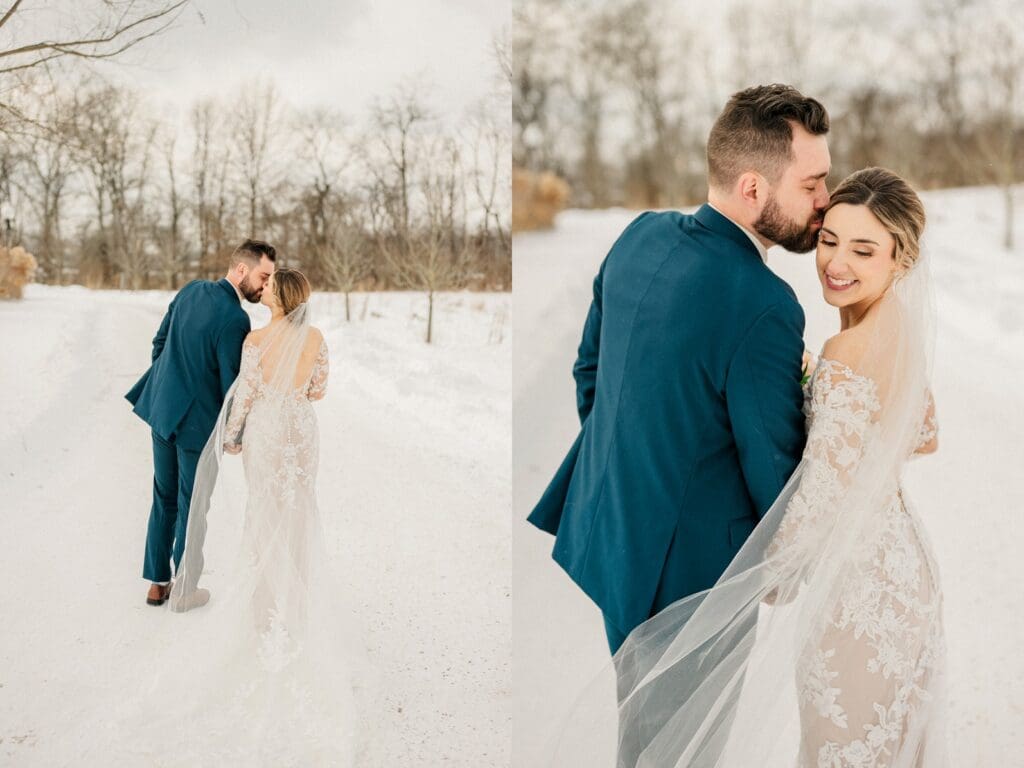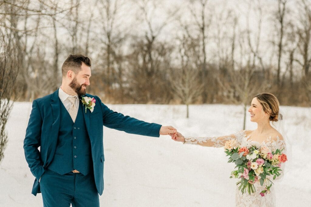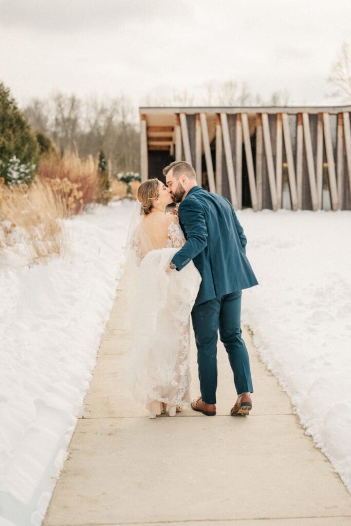 Their wedding day at Jorgensen Oak Grove at The Gardens was nothing short of magical. I will forever be in love with Jorgensen Farm as a wedding venue — it’s one of the most beautiful and thoughtfully designed wedding spaces in Ohio. We were lucky enough to photograph Amanda and Collin’s engagement session here in the summer, because they wanted to experience the property in a different season before the wedding. That made the contrast of their winter wedding day even more special.